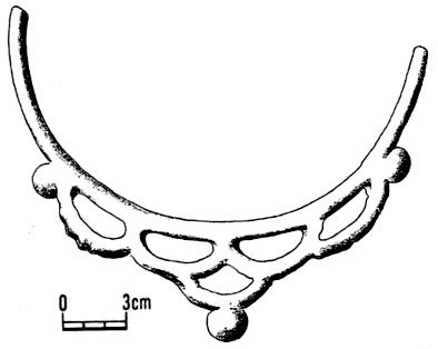 Bronzový nákrčník s pečetítkovitým zakončením a plastickou výzdobou při koncích, hladká tyčinka oválného průřezu, průměr 137 mm