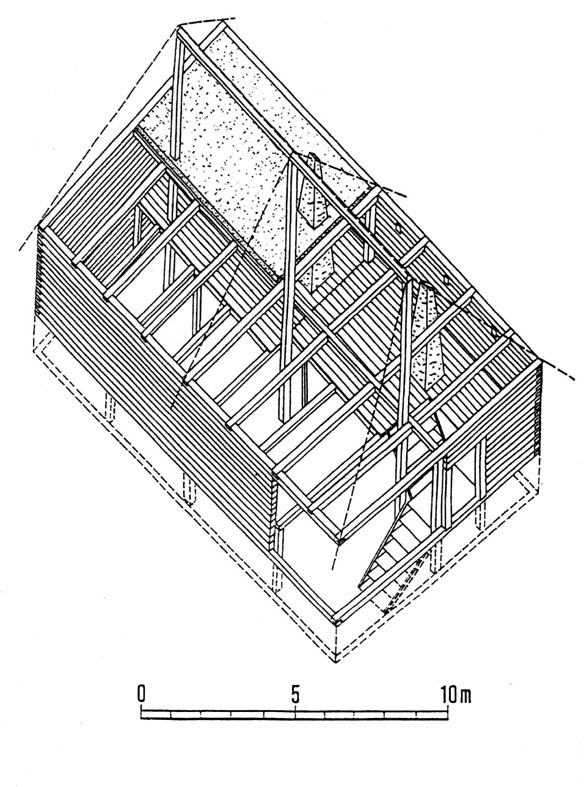 Roubený panský dům z 2. pol. 5. stol. př. Kr., Dolní Břežany. Axonometrická rekonstrukce (podle terénní dokumentace Motykové).