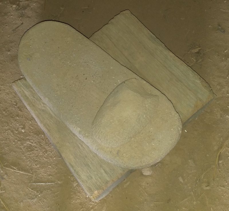 Složeno bylo ze dvou částí, spodní větší kámen s plochou je drtidlo a menší pohyblivý kámen je drtič. Tento systém se používal do ca 5. století př. n. l.