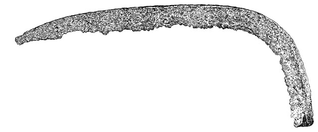 Upínací kroužek na kosu z plochého čtyřhranného pásku, konce spojeny na spodní rovné straně kováním. Průměr 42 mm, šířka pásku 12 mm; hmotnost 24 g, nález Bězdědovice